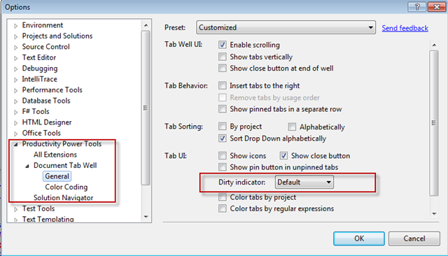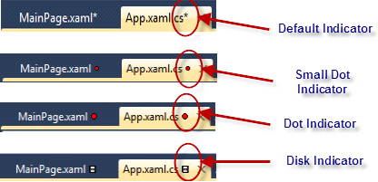 “Dirty Indicator” is nothing but the indication of “Modified Unsaved” file in Visual Studio IDE. In Visual Studio 2010, by default dirty icon shows as “*”. Using productivity tool we can customize this icon.
