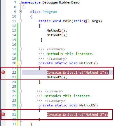 If you check the above image, debugger reached to Method2() through Method1(), but breakpoint in method1() never hits, because of the “DebugerHidden” attribute.