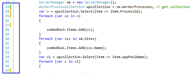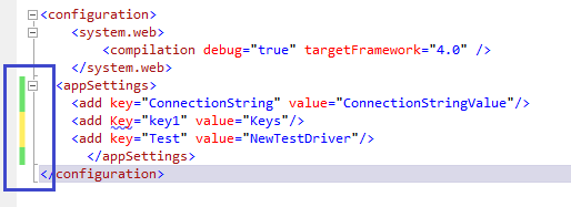 Summary : “Track Change” is one very useful features in Visual studio , by which You can see where you have edited / saved on a file for that current VS IDE state . Green color indicates the lines which you have edited before your last save.Yellow color indicates the lines which you have edited since the last save of that file. Orange color indicates that current changed line is different from the saved version of the file.