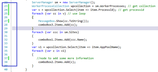 You have opened one code file in visual studio 2010 which having below lines of code. By default there is not color indicator with line number.