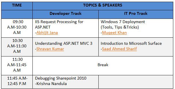 It’s a half day event for both Developer and IT Pro. Track. I will be speaking on Internals of ASP.NET Request Processing. Below is the complete agenda for the event.