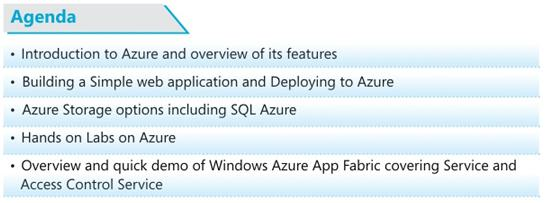 Microsoft User Group Kolkata is pleased to invite you to the Windows Azure Camp – a 1- day deep dive session designed to help you speed up on developing for Windows Azure. The Windows Azure platform is a flexible cloud-computing platform that lets your customer focus on solving their business problems.