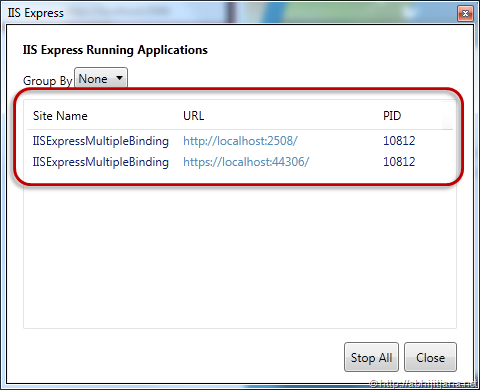 All the above URL’s are pointing to the same application. You must have noticed, PID for all 3 sites are same. This PID is nothing but the Process ID of IIS Express, which is the container of these three site. You can examine the same, using process Explorer