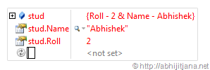 Now, assume currently you are inspecting the object “Stud” in pinned DataTips which is referring “Students[1]” , at this point you want the value of  previous “stud” object which was point to “Students[0]. Well, don’t say that we have the value in Students list and we can check it from there, yes we can, but our objective is something different here.  Let’s focus on how we can retain the previous values of Stud object.
