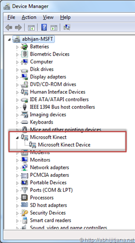 But, Camera , Sensors and Audio is yet to detect. Here is a point, To detect all Kinect elements, device need some high power supply. For that you need to plug the power supply to your Kinect Device from external Power Source. This will enables windows to detect all the components of Kinect Devices.