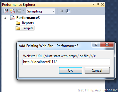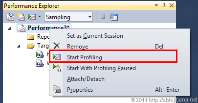 Start a new instance of Visual Studio 2010 and Open Performance Explorer from Analyze Menu . Click on the “New Performance Session” icon.