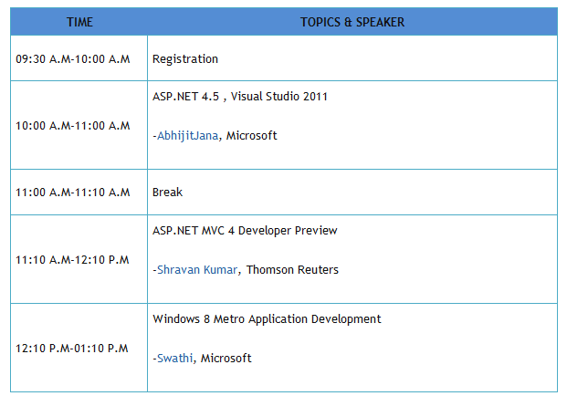 I am presenting on ASP.NET 4.5 and Visual Studio 2011 Developer Preview. This will be a complete demo oriented session where I will be talking on few new features of VS 2011 Developer preview and enhancement of ASP.NET 4.5 core runtime enhancement, data binding and new request validation features.