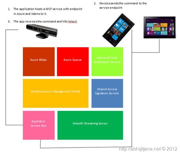 So how does the solution work. You should place Kinect devices on the locations you want to secure and keep it connected to a high end PC capable enough to do a video encoding and up streaming. The Kinect devices will be run by a WPF application running on the PC which will look for any human intrusion. While there is no human intrusion, it will remain in “Patrol Mode” where it will upload pictures of its view on regular intervals to Windows Azure. These pictures can be monitored at any point of time through the application running on Windows Phone and Windows 8. Whenever there is an human intrusion detected the Kinect changes itself to “Intrusion Mode”; it then alerts Windows Azure and also starts streaming the video to the Smooth Streaming Server hosted on Windows Azure. The Azure notifies all the devices subscribed (Windows Phone / Windows 8 ) using a toast and will allow those application to view the live streaming. From your Windows Phone / Windows 8 app you can also control the Kinect device.