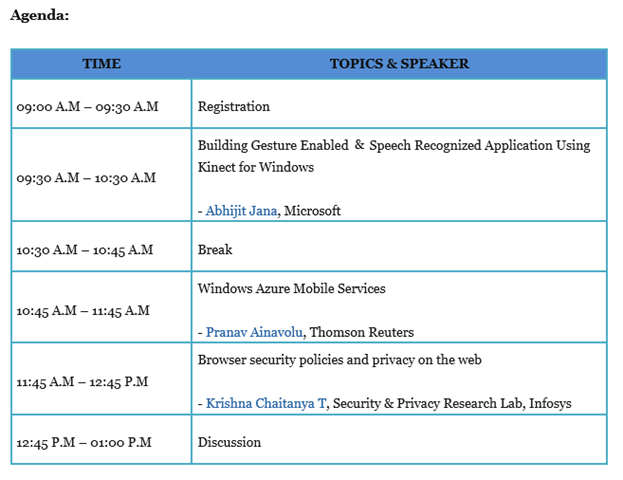 Microsoft User Group Hyderabad (MUGH ) invites you to monthly User Group Meet on 23rd Feb’13 . This monthly UG meet scheduled on coming Saturday (23rd Feb  – from  9:00 A.M ) at Infotech Enterprises Ltd, Hyderabad.