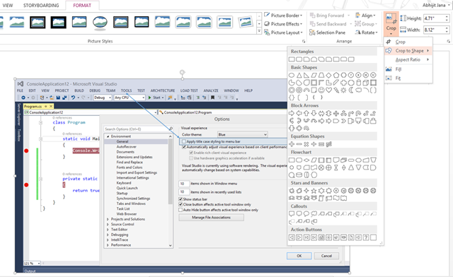 As a blogger we generally spend good amount of time by editing images, creating diagrams for blog posts. I personally use PowerPoint for most of these diagram creation and images editing for my blog post. ‘Crop Image to a Shape’ was something that I overlooked. In fact, I have seen this feature earlier, but could not realized that I could use this feature for nice image editing for my own posts. This was something I realized while writing How to change Menu Bar Style in Visual Studio 2015 ? post .