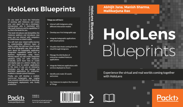 I am very pleased to announce the availability of my second book, and our first book HoloLens Blueprints – co-authored by Manish Sharma, Mallikarjuna Rao, and Myself. This book introduces and demystifies the HoloLens platform. You will start your mixed-reality journey by understanding different types of digital reality. You will learn to build your first holographic app. Also, you will understand holographic application integration possibilities within Line of Business (LOB) Applications using Azure. Moving ahead, you will create Integrated Solutions using IoT with HoloLens. Gradually you’ll learn how to create and deploy apps on a device. You will learn to publish application to the store; if you are an enterprise developer, you will also manage and distribute applications for enterprise-enabled or domain-joined HoloLens.