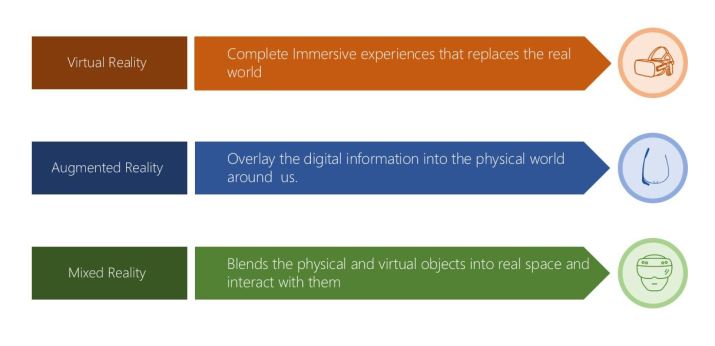 To Summarize, Virtual Reality (VR), replaces the real world, where as Augmented Reality (AR), overlays the digital contents into real space. Mixed Reality(MR) blends, virtual object and physical objects into real space.