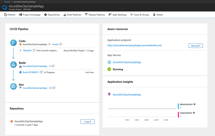 Azure DevOps Project makes it very easy to get started on Setting up code repo, build, and deployment with Azure. Just by using a few quick steps, DevOps Project set you up to everything you need for developing, deploying and monitoring your app on Azure. When we create a DevOps Project in Azure, it provisions all required Azure resources, set up Git code repository with the sample template, configure the Application Insights and set up a continuous delivery pipeline to deploy the services. It also allows you to monitor all your project related information including code commits, build, deployments from an integrated dashboard.