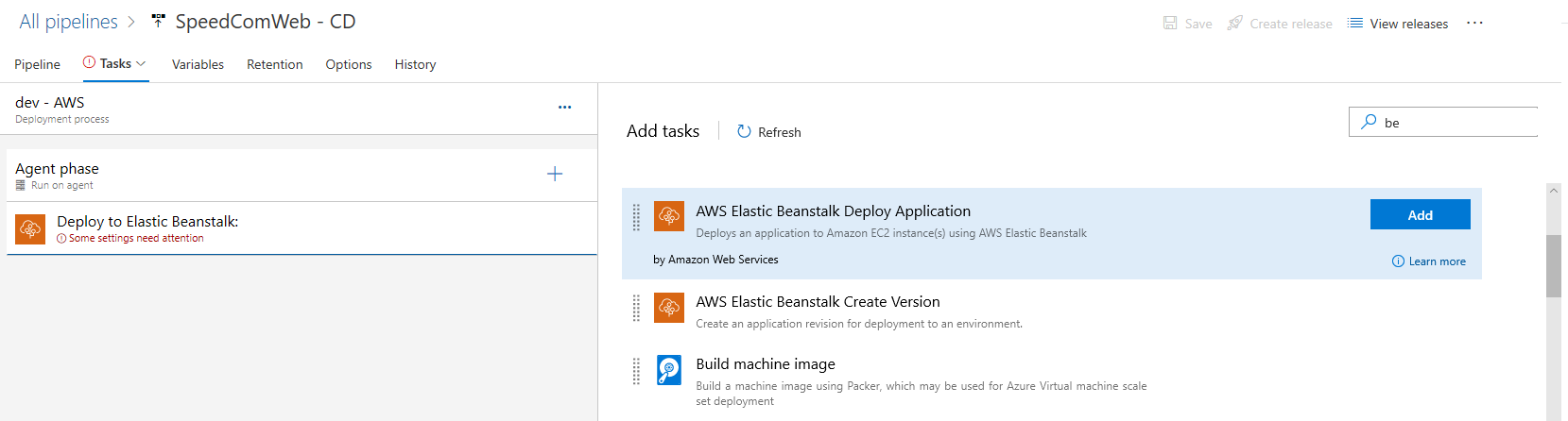 Get inside the dev – AWS stage and delete all the existing tasks. ( Here you can create a new stage as well instead clone the existing stage) . Once existing tasks are deleted from the stages – Add the “Deploy to Elastic Beanstalk” task from the list of tasks.