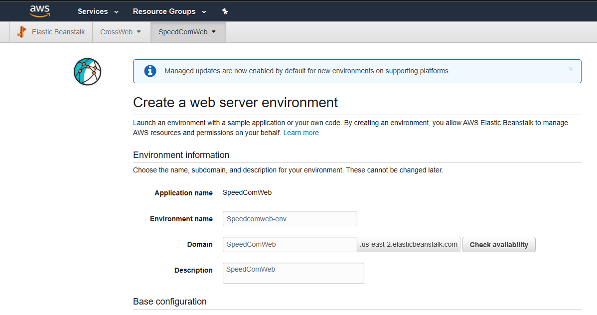 Once the application is ready, you need to create an environment to host the application. Create one Web Server environment account for the newly created app and set a sample application to run.