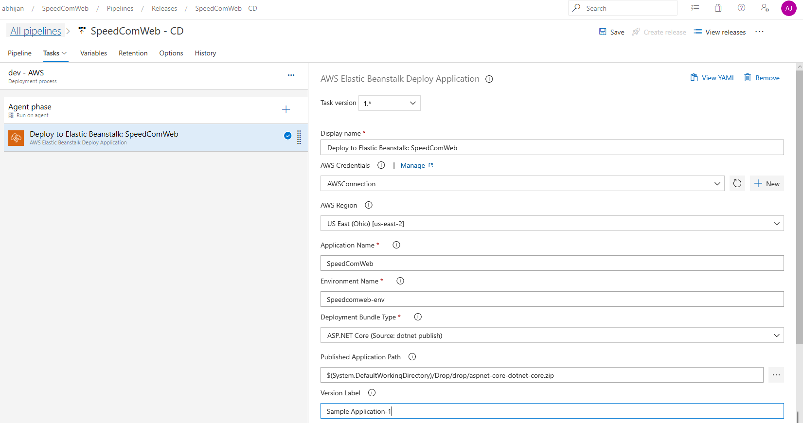 In this section, you need to provide the AWSConnection as AWS Credentials, which was created part of Service Connection. Other than that, you need to provide an application name, environment name, and version for the application. Once done, “Save” the stage and Tigger a Release.