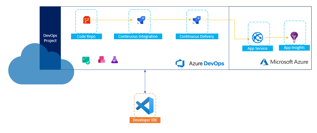 When we create a DevOps Project in Azure, it provisions all required Azure resources, set up Git code repository with the sample template, configure and set up a continuous delivery pipeline to deploy the services. It also allows you to monitor all your project-related information, including code commits, build, deployments from an integrated dashboard.