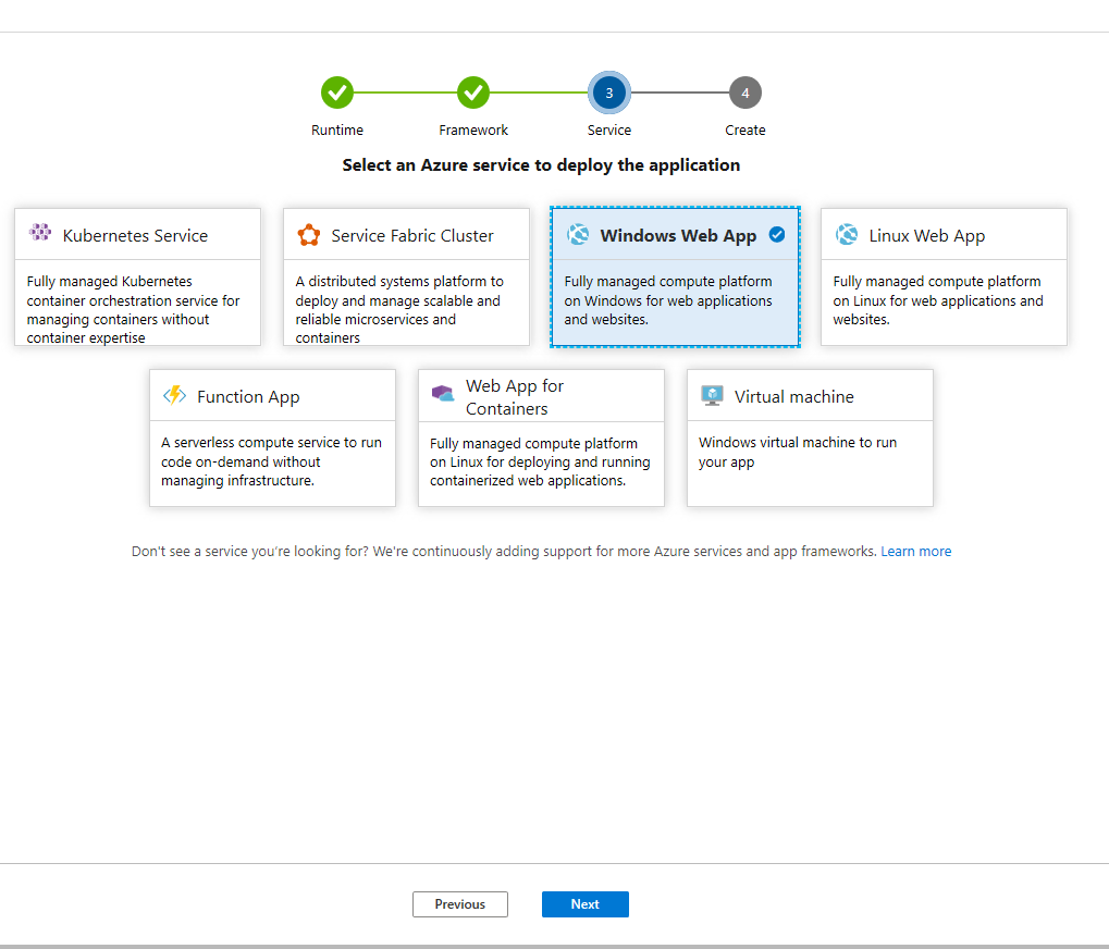 Once we choose the Runtime and Framework for the application; Provide the Azure Services, where we want to deploy. In this case; let’s choose to deploy it on a Azure App Service.