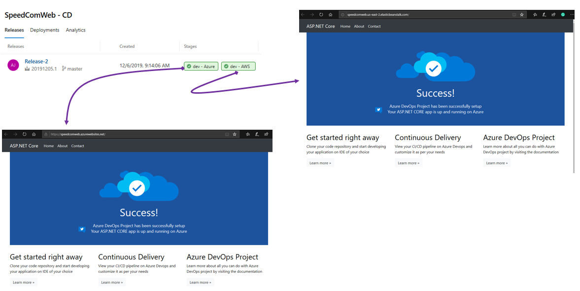 “dev – Azure” release will trigger when we create a release, and then we need to trigger the release for “dev- AWS“. Or can trigger them simultaneously as well. We can create the workflow for approval here, and they will remain the same. Once the deployment is successful, you can navigate to AWS domain URL to check the same version of a web application running on AWS Cloud and Azure.
