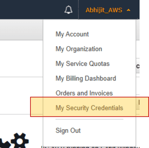 Log in to your AWS Account, from the Profile menu select “My Security Credentials“.