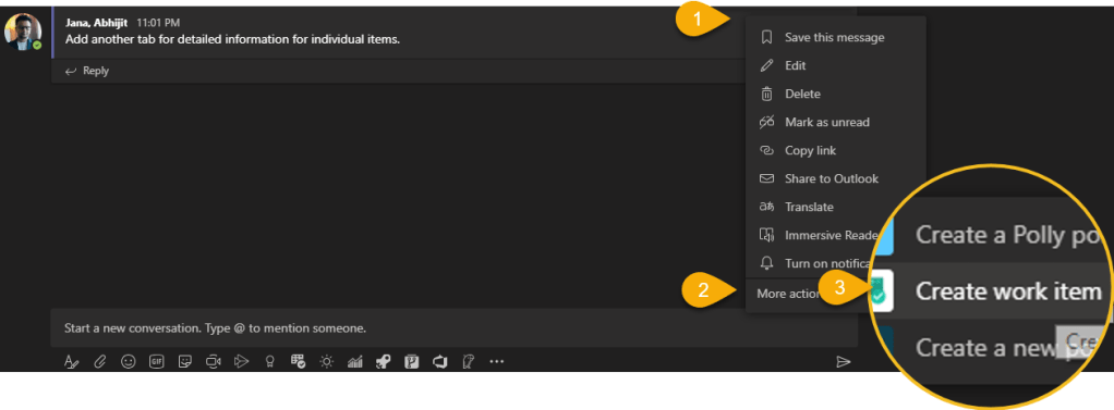 Another very useful feature that you can use to create work items directly from Microsoft Teams.