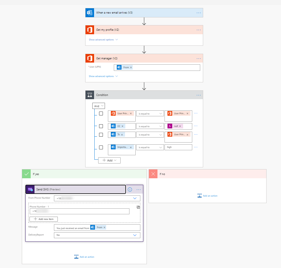 - Receive an SMS when there is an email from your direct report – Check the User Principal of Get my profile (V2) and User Principal of Get Manager (V2) if the same.