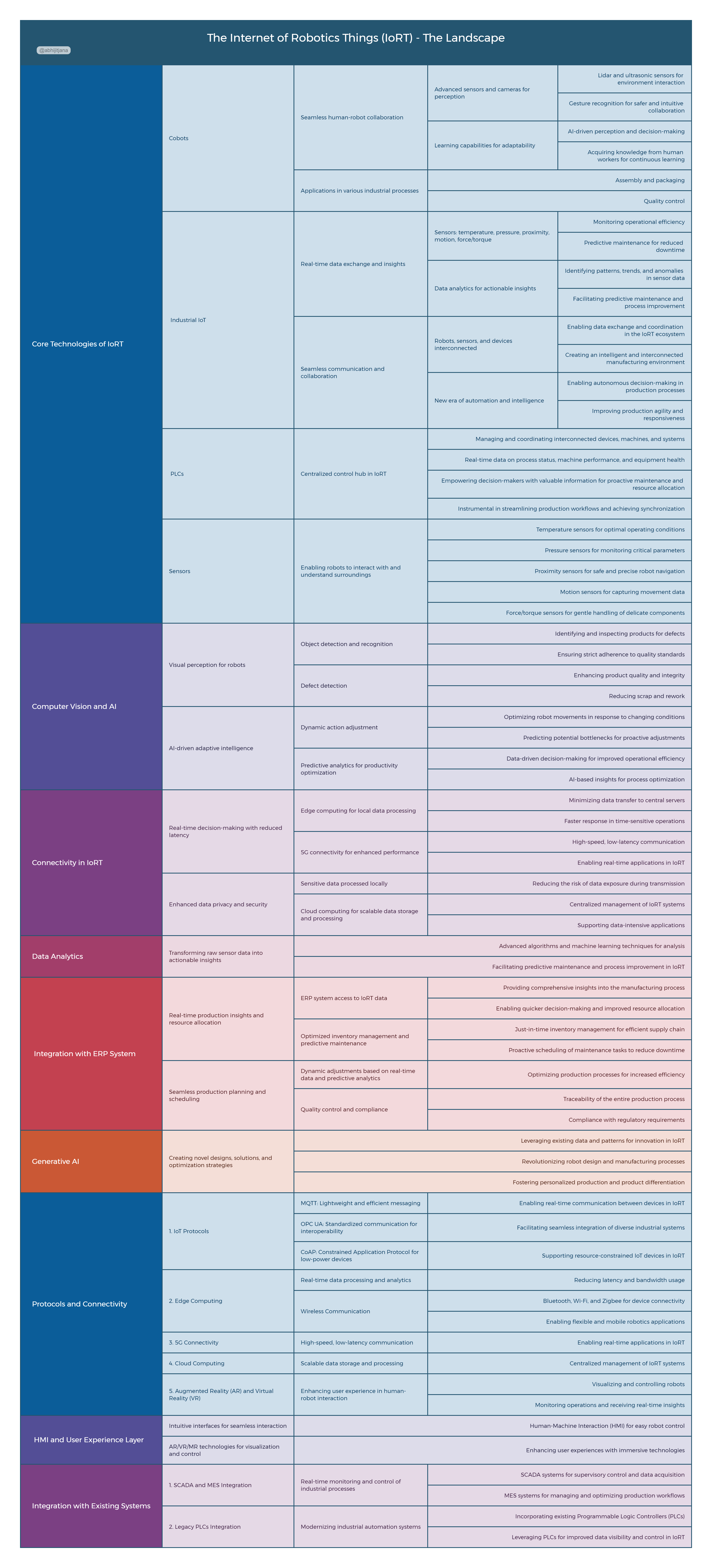 The Internet of Robotics Things (IoRT) heralds a transformative era in manufacturing, fusing IoT, AI, and Robotics to drive smart automation and innovation. IoRT’s seamless integration unleashes unparalleled efficiency, flexibility, and customization, paving the way for a more agile and intelligent future in manufacturing. As we embrace the synergy of IoT and Robotics, the era of smart automation powered by IoRT is set to reshape industries across the globe. Leveraging data analytics, integrating PLCs, and adopting generative AI further enhance IoRT’s potential, unlocking new possibilities for industrial automation in the Industry 5.0 era, particularly in device manufacturing using Cobots. Embracing IoT at the edge and integrating IoRT with ERP systems empowers real-time decision-making and offers a holistic approach to manufacturing management, revolutionizing the way industries operate and propel Industry 5.0 towards greater heights of productivity, efficiency, and competitiveness.