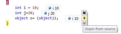 The Visual Studio 2010 IDE is simply great and came up with many new features within it. I have found one of the great and innovative features in Debugging style in VS 2010 Professional Beta 2 that is Pin/Unpin Object/Variable Inspect or Data Tip.